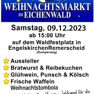 Am 09.12.2023 könnt Ihr uns auf dem Weihnachtsmarkt im Eichenwald besuchen. Der traditionsreiche Weihnachtsmarkt auf dem Waldfestplatz in Engelskirchen-Remerscheid gehört zu den schönsten im Bergischen Land. Klein aber fein! Wir freuen uns auf Euch!