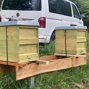 Die beiden Insektenhotels sind in den letzten Tagen fertig geworden und wurden am Freitag von AG-Mitgliedern auf den Lehrpfad gebracht. Heute morgen habe ich, nachdem die Kollegen die ersten Deutsch Normal und Dadant Völker schon auf dem Lehrpfad stehen haben, meine 2 Zander Völker hochgebracht.